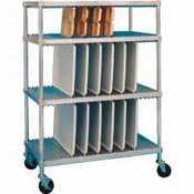 Designed to ensure maximum air circulation for tray and pan drying. Channels provide drainage and hold trays securely.Maneuvers easily on 5" polyurethane swivel stem casters, two with locks. Constructed of heavy duty aluminum. Overall Dimensions: 60" W x 24" L x 71" HPan Capacity: 1"Space Between Shelves: Adjustable Number of Shelves: 4